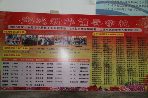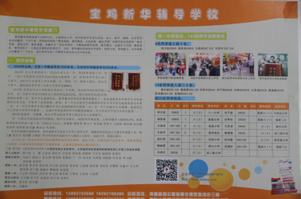新華輔導學校為1998年8月由寶雞市教育局批準創建的專業從事中小學階段文化課程課外輔導學校(辦學許可證號:161030270000391)。十八年來,學校始終堅持“緊貼基礎、循序漸進、啟迪思維、融會貫通”的教學思想和“保證質量、誠信辦學、良心育人、服務家庭、奉獻社會”的辦學理念,不斷創新教學思想、教學模式,不斷加大基礎投入,改善辦學條件,打造強有力的教師團隊,扎實提高學校的管理水平和專業能力,促使教學質量不斷提高,使學校年年邁新步,年年上臺階。在這幾年激烈的行業競爭中,學校仍然在西安各大名校和寶一中小升初、初升高招考中獲得大面積豐收,上線率連年固定在38%左右。