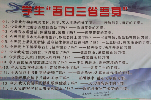 營造文化氛圍,建立德育體系學校先后制定了《學生必修的十項美德》、《學生‘吾日三省吾身’》十四條修身紀律、《學生百分制考核制度》、《學習制度》、《清潔衛生制度》、《安全制度》等規范學生的行為。將數學家華羅庚、科學家錢學森、音樂家聶耳等英雄模范人物肖像和名言懸掛在校園的醒目位置,使學生學有榜樣,趕有目標。
