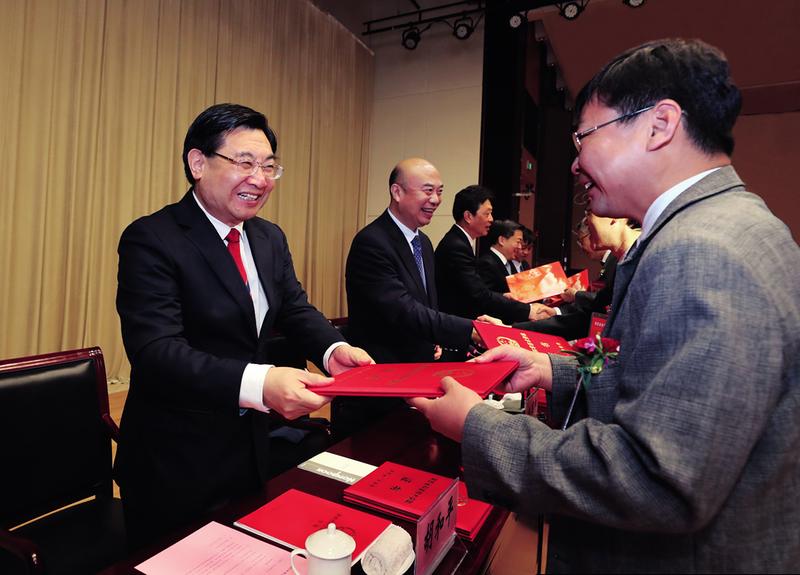 5月22日,全省科學(xué)技術(shù)獎勵大會在西安召開。省委書記胡和平為全省基礎(chǔ)研究重大貢獻(xiàn)獎獲獎?wù)咝熳诒驹菏俊㈥愔灸显菏款C發(fā)獎勵證書。省長劉國中講話。省委常委、西安市委書記王永康,省人大常委會副主任、榆林市委書記戴征社出席。副省長陸治原主持會議并宣讀《陜西省人民政府關(guān)于2017年度科學(xué)技術(shù)獎勵的決定》。